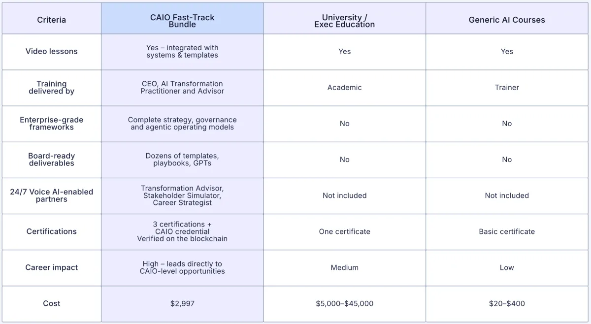 Unlike many certificates that just signal completion, ours validates that you can apply AI frameworks, run workshops, and produce boardroom-ready deliverables. Passing the exam demonstrates to executives and employers that you can execute at an enterprise level, not just study theory.